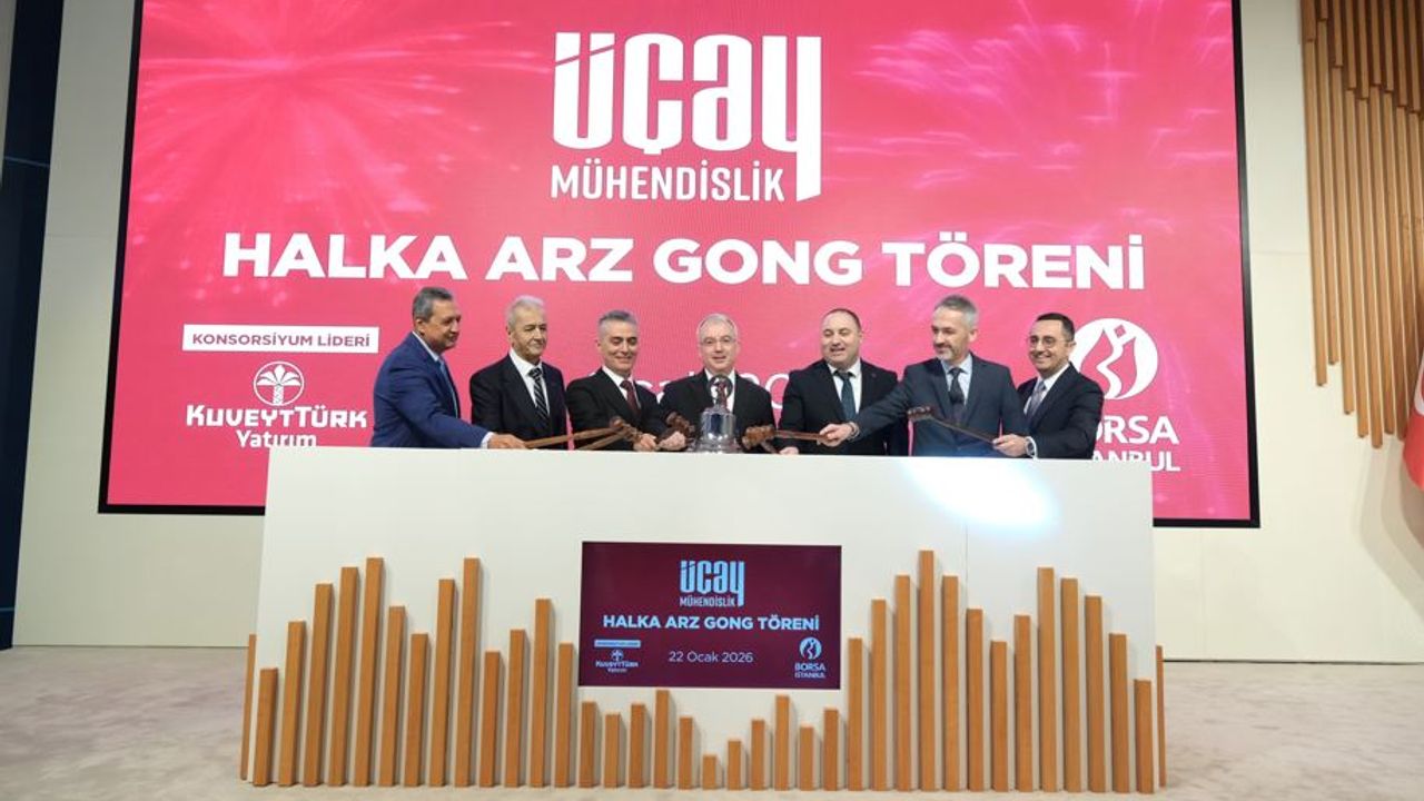 25 yılı aşkın deneyimiyle Türkiye’nin önde gelen mühendislik ve enerji şirketlerinden Üçay Mühendislik ilk gong ile sermaye piyasalarına adım attı. Kuveyt Türk Yatırım liderliğinde, 14-15-16 Ocak 2026 tarihlerinde talep toplama sürecini tamamlayan şirket, UCAYM koduyla, Borsa İstanbul Ana Pazar’da işlem görmeye başladı. Gong töreni; Borsa İstanbul A.Ş. Genel Müdürü Korkmaz Ergun, Üçay Mühendislik Yönetim Kurulu Başkanı Ayhan Karacabey, Üçay Mühendislik Yönetim Kurulu Başkan Yardımcısı Mustafa Bozkurt, Üçay Mühendislik İcra Kurulu Başkanı ve CEO’su Turan Şakacı, Kuveyt Türk Yatırım Genel Müdürü Selman Ortaköy, Kuveyt Türk Yatırım Kurumsal Finansman Direktörü Abdülkadir Sadıkoğlu ve çok sayıda davetlinin katılımıyla gerçekleşti.
