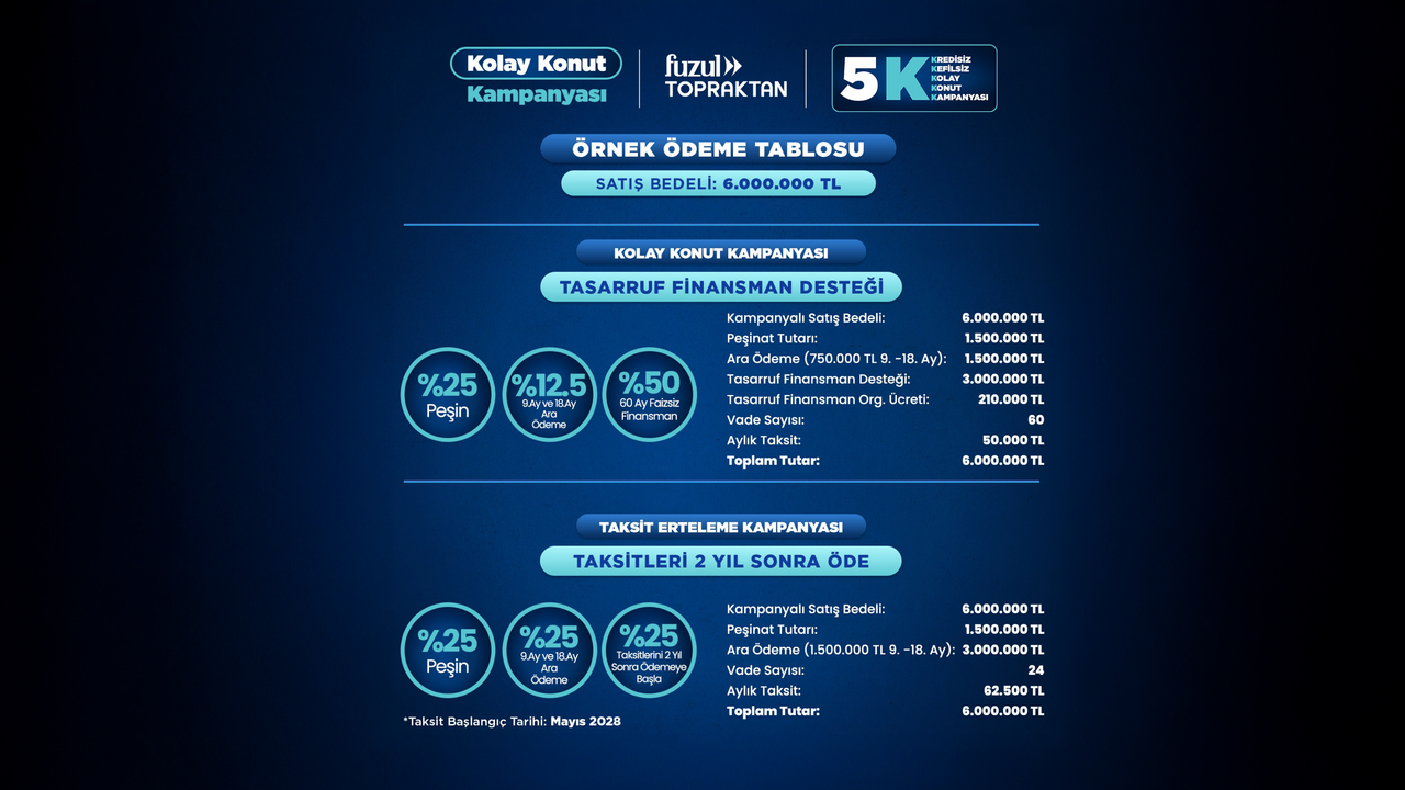 “Kefilsiz, Kredisiz, Kolay Konut Kampanyası” olarak da adlandırılan 5K; Başakşehir, Ispartakule ve Pendik bölgelerinde yapımı devam eden seçili projeleri kapsıyor. Kampanya çerçevesinde konut bedelinin yüzde 25’i peşinat olarak ödeniyor, 9. ve 18. aylarda gerçekleştirilen ara ödemelerle birlikte toplam tutarın yarısı Fuzul Topraktan tarafından karşılanıyor. Kalan yüzde 50’lik bölüm ise tasarruf finansman sistemi aracılığıyla 60 aya kadar faizsiz taksitlendirme ile finanse ediliyor.